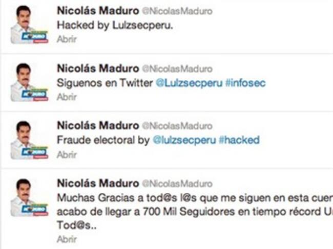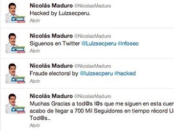 La cuenta de Twitter del candidato Nicolás Maduro fue pirateada minutos antes del cierre de las mesas de votación en Venezuela, denunció el Gobierno y el equipo de campaña del chavismo.