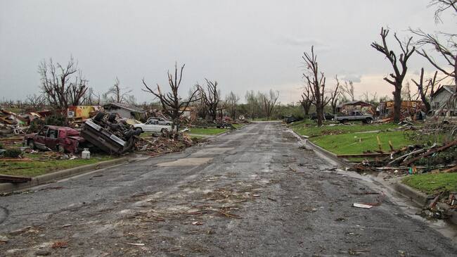 Street with bare tree in Joplin Tornado morning. / L. Shaefer