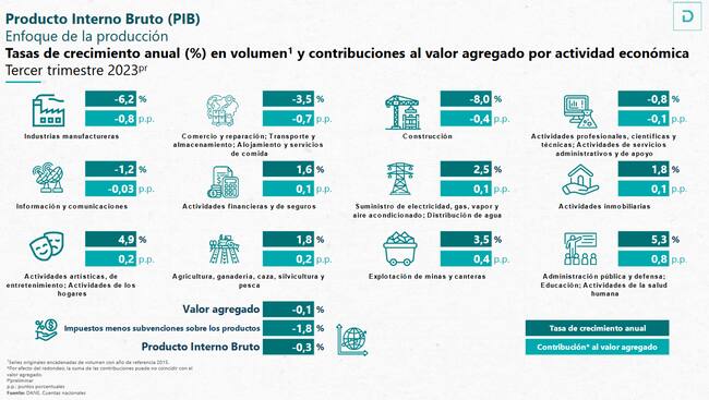 Según el más reciente informe del Dane, para el tercer trimestre de 2023 en Colombia, es decir, julio - septiembre, el Producto Interno Bruto registró una contracción de 0,3%; esta cifra fue menor a la que se registró respecto al mismo periodo del año anterior, cuando logró un crecimiento del 7,0%.