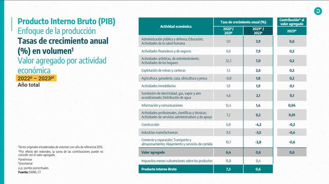 Según cifras del Dane, la economía colombiana durante 2023 creció 0,6%, cifra inferior a la que se había registrado en el crecimiento de 2022, cuando fue de 7,3%.