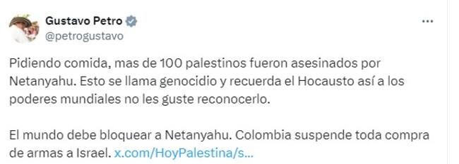 “El mundo debe bloquear a Netanyahu. Colombia suspende toda compra de armas a Israel”, dijo el mandatario.