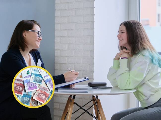 Joven asesorándose sobre el Régimen de Prima Media. En el círculo, la imagen de billetes colombianos (Fotos vía GettyImages)