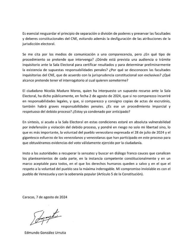 Edmundo González Urrutia, candidato de la coalición opositora Plataforma Unitaria en las elecciones presidenciales del pasado 28 de julio, emitió un comunicado donde fijó posición con respecto a su citación ante la Sala Electoral del Tribunal Supremo de Justicia (TSJ) prevista para hoy miércoles, 7 de agosto, a las 11:00 de la mañana, hora local.