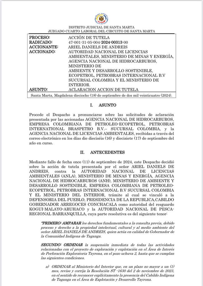 El juez precisó que el fallo no ordenó el cierre definitivo del pozo Uchuva 2, pero indicó que se debe adelantar la consulta previa con la comunidad indígena de Taganga.