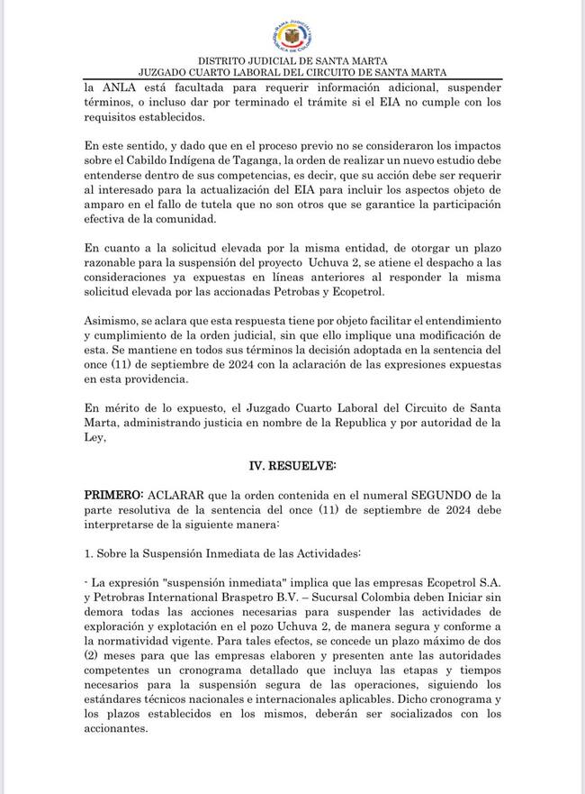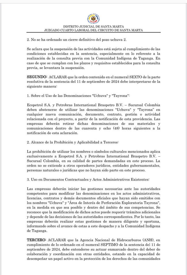 “No se ha ordenado un cierre definitivo del pozo Uchuva 2. Se aclara que la suspensión de las actividades está sujeta al cumplimiento de las condiciones establecidas en la sentencia, especialmente en lo referente a la realización de la consulta previa con la comunidad indígena de Taganga. En caso de que se cumplan con los plazos y requisitos establecidos para la consulta previa, se levantará la suspensión”.