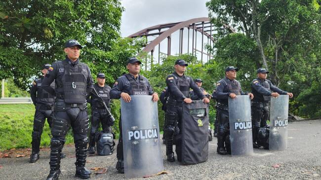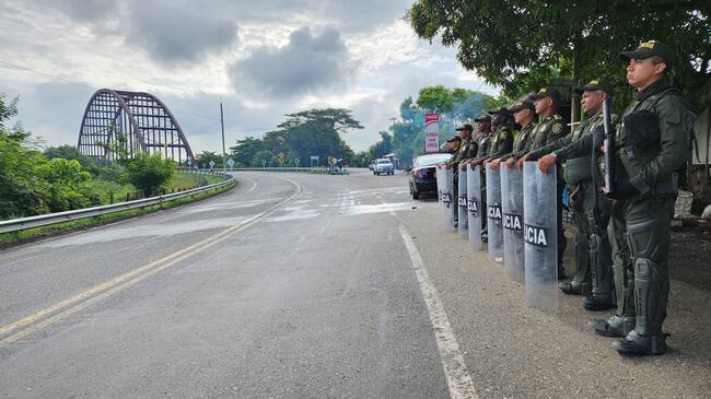 Uniformados de la Policía se concentran de manera preventiva en el puente San Jorge, a la altura del municipio de La Apartada.