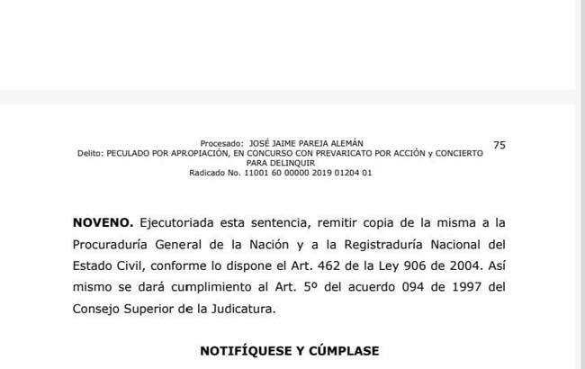 En ese sentido, en el fallo se dispuso que “como consecuencia de lo anterior, se impone una pena al señor JOSÉ JAIME PAREJA ALEMÁN, de ciento ochenta (180) meses de prisión – 15 años -. Pagará una multa a favor de la nación, en cuantía de mil quinientos millones cuarenta y cinco mil seiscientos pesos (1.525.045.600)”.