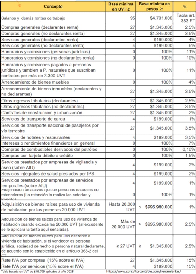 La tabla de retención en la fuente 2025 actualiza las bases y tarifas para IVA, ICA y Renta, con una UVT fijada en $49.799. Conozca los detalles clave.