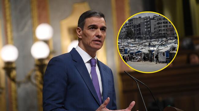 Presidente de España, Pedro Sámchez. FOTO: Fernando Sanchez/Europa Press via Getty Images. // Campamento de desplazados en Franja de Gaza. FOTO: SAEED JARAS/Middle East Images/AFP via Getty Images