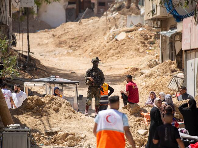 Residentes palestinos en un campamento tras ataque militar de Israel. FOTO: MOJAHID NAW/Middle East Images/AFP via Getty Images / MOJAHID NAW