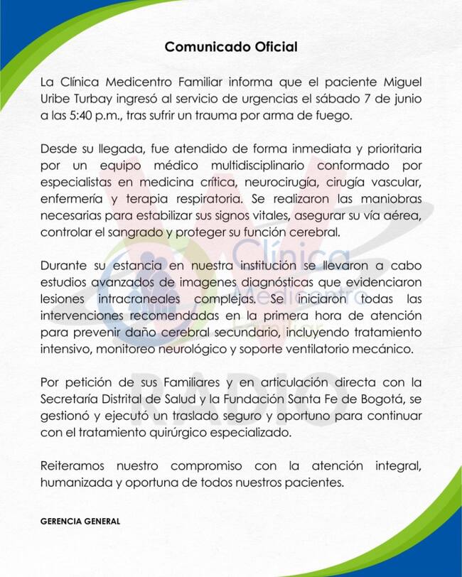 Por medio de un comunicado, la Clínica Medicentro explicó el tratamiento que le realizaron al precandidato presidencial y senador Miguel Uribe Turbay luego del atentado del que fue víctima en la localidad de Fontibón en Bogotá.