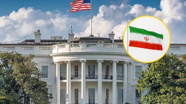 Referencia de Casa Blanca EE.UU. y bandera de Irán. Foto: Caroline Purser y Wong Yu Liang vía Getty Images.