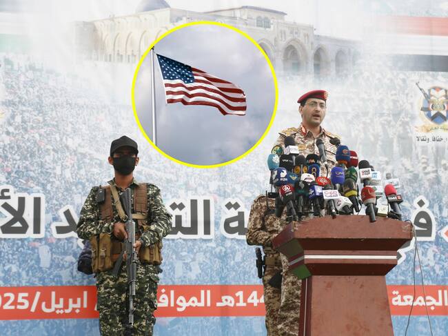Portavoz militar de los hutíes, Yahya Sarea y bandera de EE.UU.Foto:Mohammed Hamoud y H. Armstrong Roberts/Classicstock/Getty Images