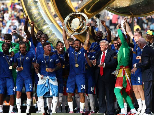 Reece James lifts the trophy with teammates next to US President Donald Trump during the award ceremony for the FIFA Club World Cup 2025 Champions.(Photo by FRANCK FIFE / AFP) (Photo by FRANCK FIFE/AFP via Getty Images) / FRANCK FIFE