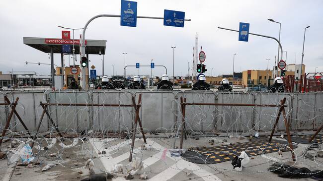 GRODNO REGION, BELARUS - NOVEMBER 22, 2021: A Polish police force are seen behind a barbed wire fence at Kuznica Bialostocka-Bruzgi border crossing on the Belarusian-Polish border. The migrant crisis on the border of Belarus with Poland, Lithuania, and Latvia escalated on November 8. This year, Polish border guards have prevented more than 35,000 attempts to illegally cross the Polish-Belarusian border, which is 400 times more than last year. Sergei Bobylev/TASS (Photo by Sergei Bobylev\TASS via Getty Images) / Sergei Bobylev