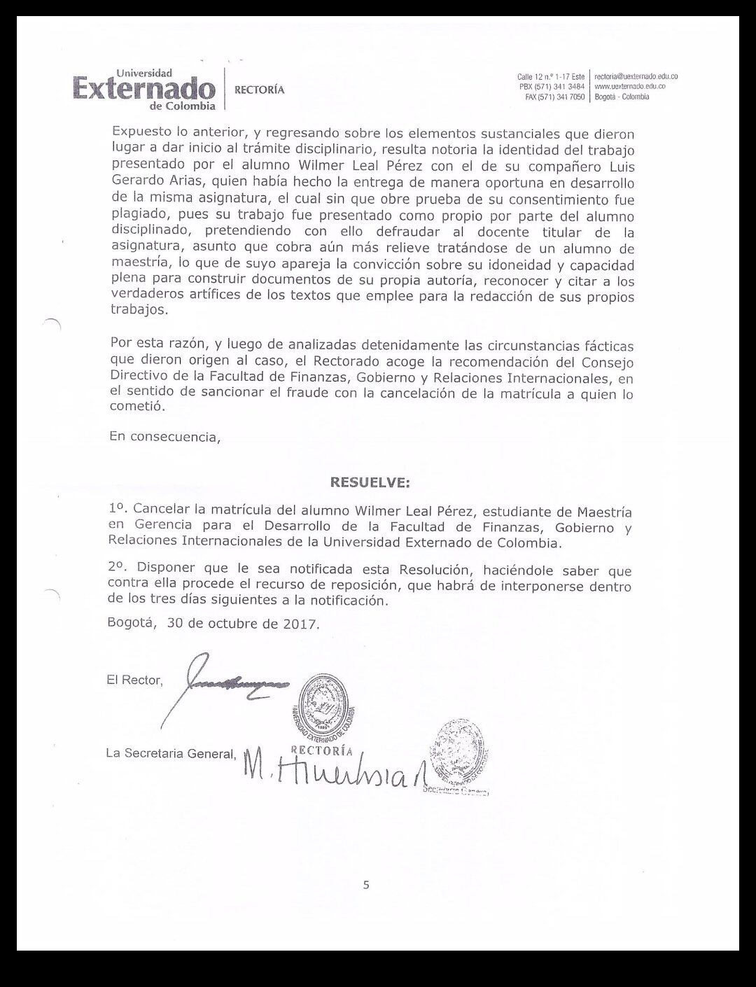 En ese entonces Leal era estudiante del programa de Maestría en Gerencia para el Desarrollo, de la Facultad de Finanzas, Gobierno y Relaciones Internacionales, y fue llamado a rendir descargos.