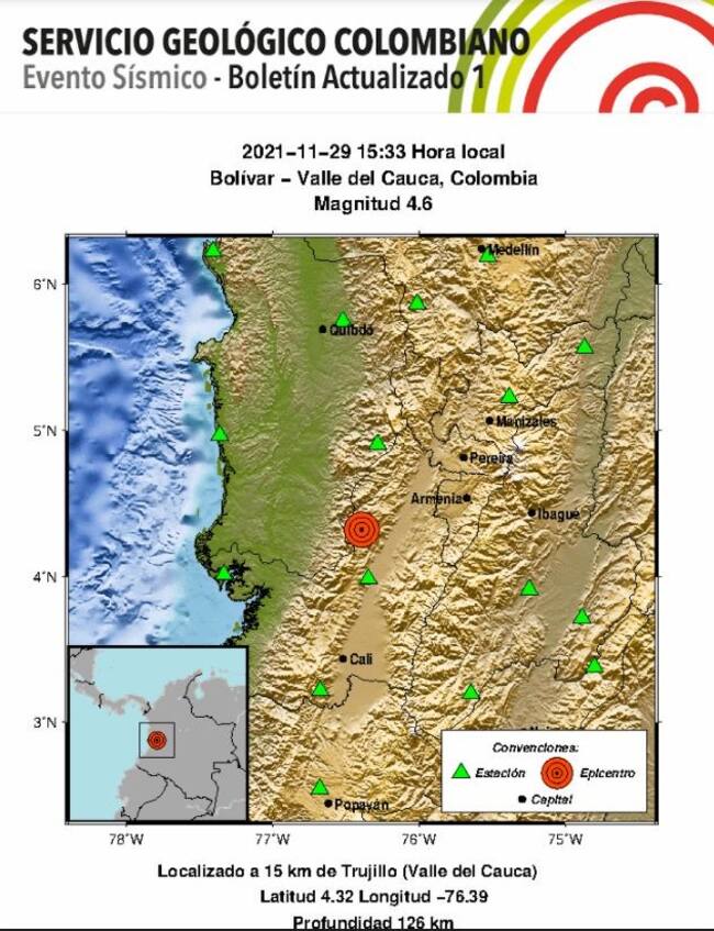 Según el Servicio Geológico Colombiano, la magnitud fue de 4,6 en a la escala de Richter con profundidad de 126 kilómetros.