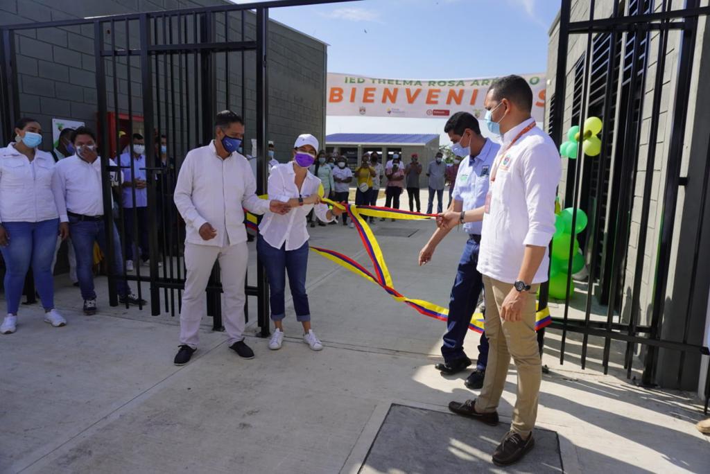 Junto con las autoridades, estudiantes y padres de familia del corregimiento Varela, de Zona Bananera, la Gerente del Fondo Adaptación, Raquel Garavito Chapaval, entregó la Institución Educativa ‘Thelma Rosa Arévalo’, una estructura de 2.615 metros cuadrados, adaptada al cambio climático, de la que se beneficiarán 1.104 niños, niñas y adolescentes de educación preescolar, primaria y secundaria, gracias a la inversión hecha por la Entidad de $8.169 millones.