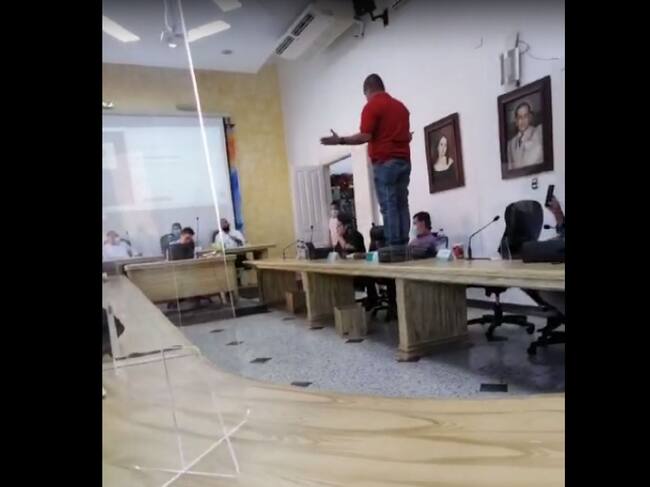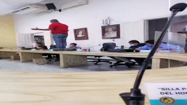 Un video filtrado por la misma corporación muestra cómo el concejal del partido Cambio Radical, Darinel Villamizar, se sube a la mesa desesperado para llamar la atención y para que le den la palabra por parte de la mesa directiva.