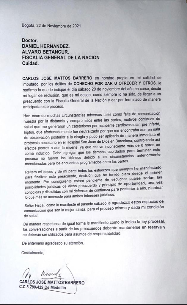 En la carta Mattos pide preacuerdo y principio de oportunidad y con singular astucia deja constancia escrita de la controversial conversación del sábado anterior. En el primer párrafo dice: “reafirmo lo que indiqué el día sábado 20 de noviembre del año curso, desde mi lugar de reclusión”.
