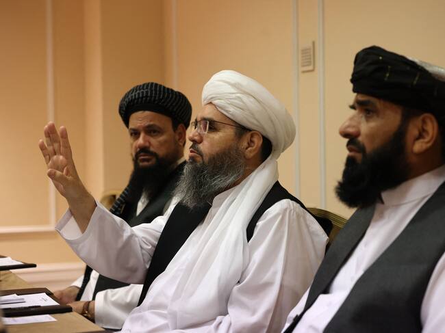 Taliban negotiators Abdul Latif Mansoor (L), Shahabuddin Delawar (C) and Suhail Shaheen (R) attend a press conference in Moscow on July 9, 2021. (Photo by Dimitar DILKOFF / AFP) (Photo by DIMITAR DILKOFF/AFP via Getty Images) / DIMITAR DILKOFF