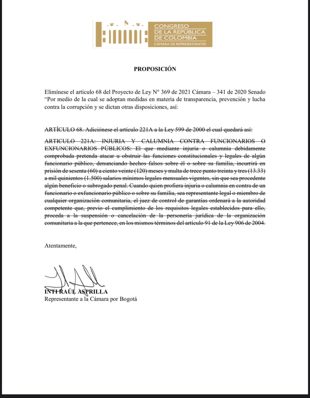 El representante a la Cámara de la Alianza Verde, Inti Asprilla, radicó una proposición para eliminar el artículo 68 del proyecto de ley de transparencia, impulsado por el Gobierno, que tiene preocupados a los medios de comunicación.