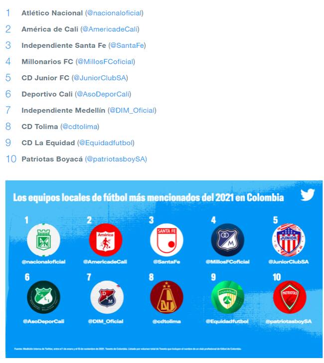 Una de las mediciones que reveló fue los equipos colombianos más mencionados en este año y Atlético Nacional, equipo que ha sido noticia por su temprana eliminación del rentado local, fue el más citado por los internautas, superando a otros grandes como América de Cali y Millonarios.