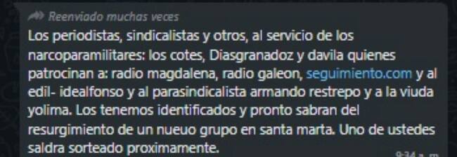Las amenazas mencionan a Radio Galeón, Radio Magdalena, Seguimiento.com, Edilfonso Orozco, Armando Restrepo y Yolima Ruiz