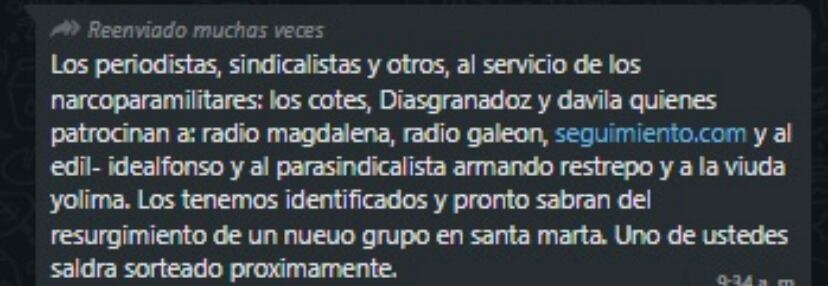 La tensión incrementa en Santa Marta después de que circularan chats de WhatsApp en donde se amenaza a distintos líderes y medios de comunicación del departamento. Sin identificarse, los remitentes advierten que “los tienen identificados y pronto sabrán del resurgimiento de un nuevo grupo armado en Santa Marta”. Finalmente, se anunció que una de las personas mencionadas “saldrá sorteado próximamente”.