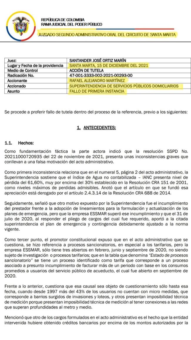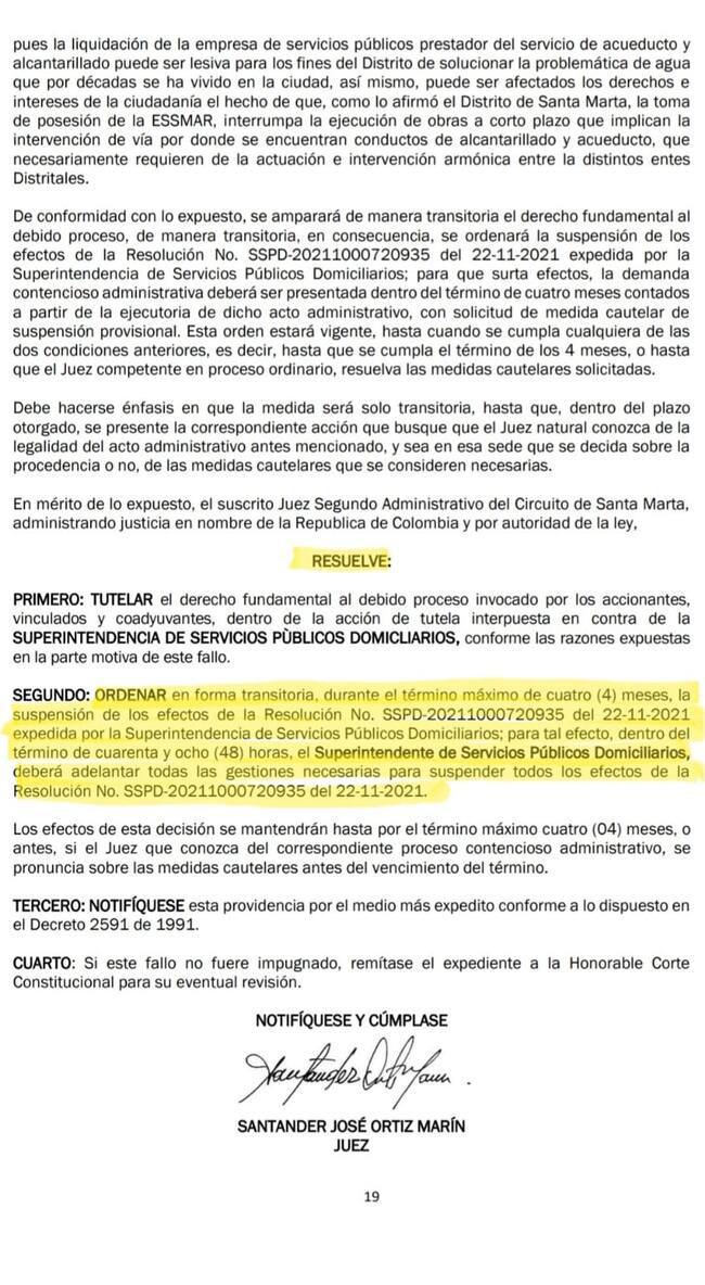 El Juzgado Segundo Administrativo Oral del Circuito de Santa Marta ordenó, mediante fallo de tutela del 15 de diciembre, en forma transitoria durante el término máximo de 4 meses la suspensión de la resolución con la que la superservicios intervino y tomó posesión de la empresa Essmar ESP, para tal efecto en un término de 48 horas el Superintendente de Servicios Públicos Domiciliarios, deberá adelantar todas las gestiones necesarias para suspender la resolución.