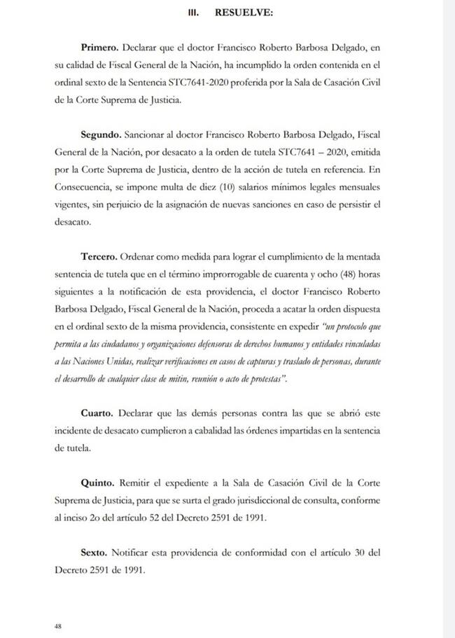 Un Tribunal impuso una multa al Fiscal General de la Nación, Francisco Barbosa, por incurrir en un desacato a un fallo de la Corte Suprema de Justicia que ordena la creación de un “protocolo que permita a los ciudadanos y organizaciones defensoras de derechos humanos y entidades vinculadas a las Naciones Unidas, realizar verificaciones en casos de capturas y traslado de personas durante el desarrollo de cualquier clase de mitin, reunió o acto de protestas”.