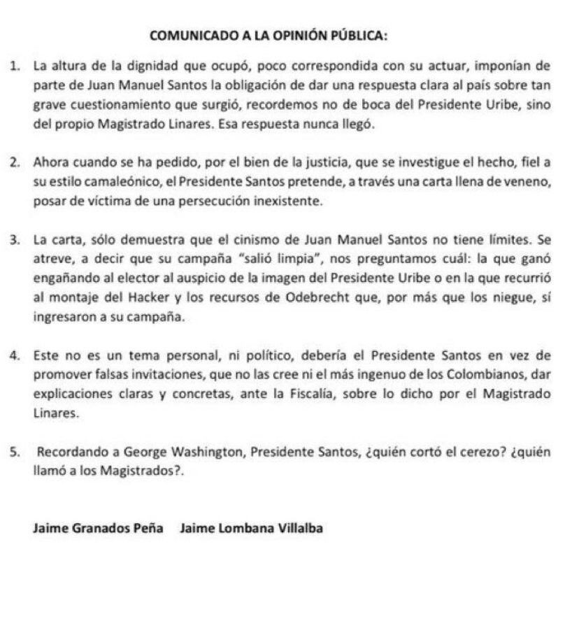 En el comunicado, los juristas Jaime Granados y Jaime Lombana, señalan que Santos pretende posar de víctima en lo que califican una carta cargada de veneno y se refieren al exmandatario cómo un camaleónico, promovedor de falsas invitaciones al que nadie le cree.