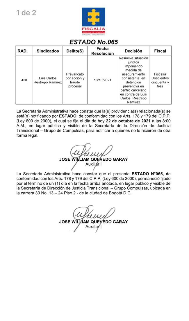 El 13 de octubre de 2021, la Fiscalía 253 notificó que en decisión del 30 de agosto se “resuelve situación jurídica imponiendo medida de aseguramiento consistente en detención preventiva en centro carcelario en contra de Luis Carlos Restrepo Ramírez”.
