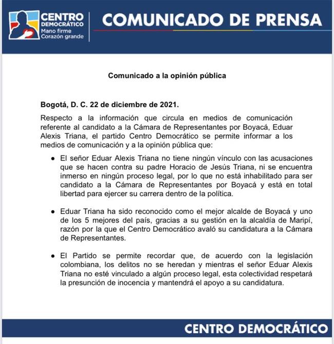 Comunicado del Centro Democrático sobre Eduar Alexis Triana