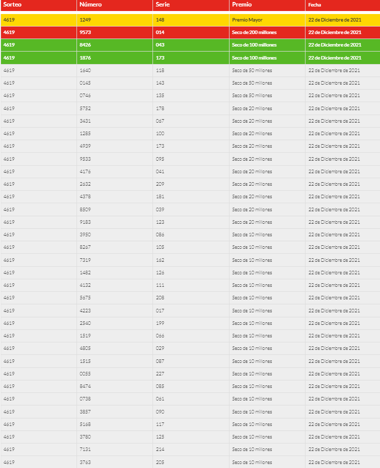 El resultado del premio mayor del sorteo 4619 es: 1249 de la serie 148.
