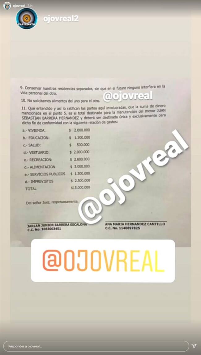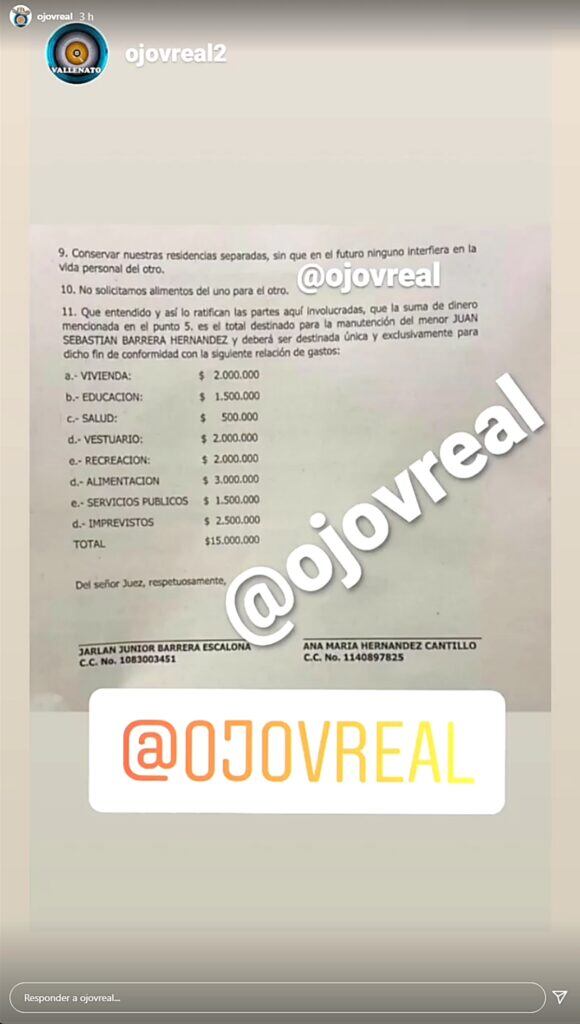 Asimismo, se conoció un documento que expone que el centrocampista y Ana María Hernández acuerdan su divorcio y se especifica que el deportista se haría cargo de todo lo que requiera el infante. Sin embargo, en este papel legalizado y remitido a un juez de familia no se evidencia la firma de ninguna de las partes ni un sello de radicación que indicaría la veracidad del divorcio.