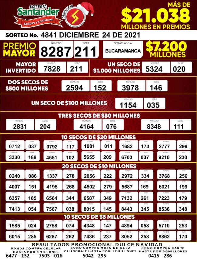 Entérese de los resultados del sorteo 4841 de la Lotería de Santander de este 24 de diciembre de 2021.