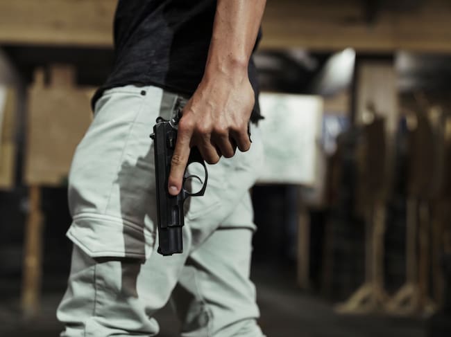 Close-up of man holding a pistol in an indoor shooting range / Kike Arnaiz