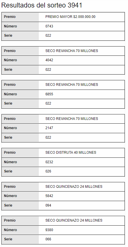 El resultado del premio mayor del sorteo 3941 es: 0743 de la serie 022.