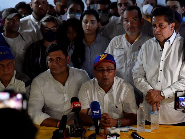 The opposition candidate for governor of the state of Barinas, Sergio Garrido (C) speaks next to former candidate Freddy Superlano (2nd L), during a press conference on the gubernatorial election in the city of Barinas, Venezuela, on January 09, 2022. (Photo by Federico Parra / AFP) (Photo by FEDERICO PARRA/AFP via Getty Images) / FEDERICO PARRA