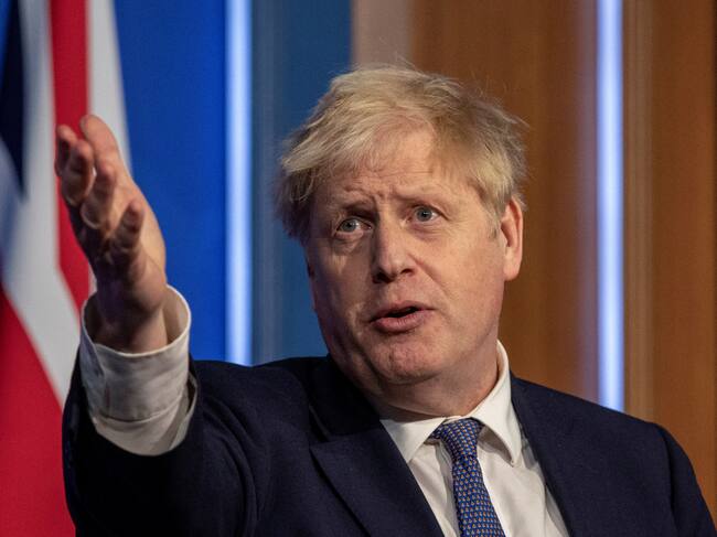 Britain's Prime Minister Boris Johnson speaks during a virtual press conference to update the nation on the status of the Covid-19 pandemic, in the Downing Street briefing room in central London on January 4, 2022. - British hospitals have switched to a "war footing" due to staff shortages caused by a wave of Omicron infections, the government said Tuesday, as the country's daily Covid caseload breached 200,000 for the first time. (Photo by Jack Hill / POOL / AFP) (Photo by JACK HILL/POOL/AFP via Getty Images) / JACK HILL