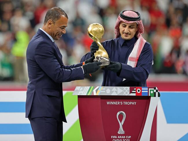 Former Saudi Arabian international Nawaf al-Temyat (R) and former Brazilian world cup winner Cafu carry the trophy at the end of the FIFA Arab Cup 2021 final football match between Tunisia and Algeria at the Al-Bayt stadium in the Qatari city of Al-Khor on December 18, 2021. (Photo by KARIM JAAFAR / AFP) (Photo by KARIM JAAFAR/AFP via Getty Images) / KARIM JAAFAR