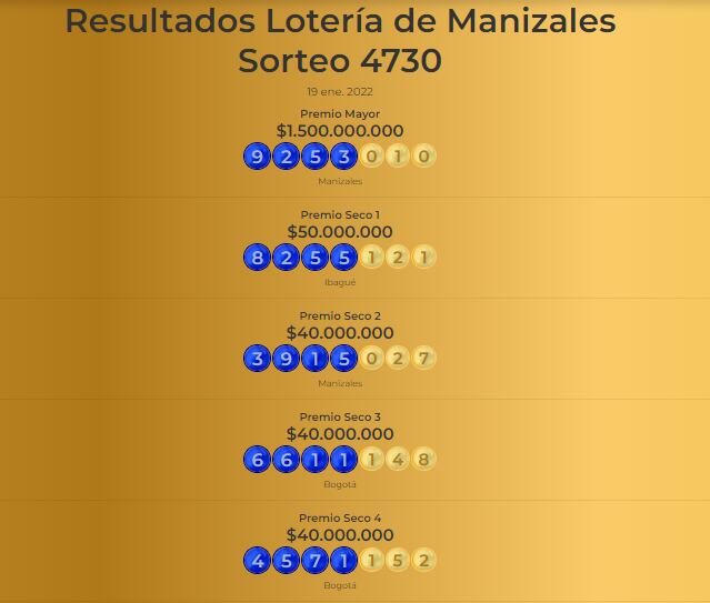 Entérese de los resultados del sorteo 4730 de la Lotería de Manizales de este 19 de enero del 2022.