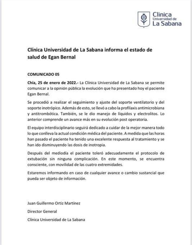 Por su parte, la Clínica Universidad de La Sabana anunció que le realizaron la extubación que tenía el ciclista. Además, precisan que Egan Bernal ya tiene movilidad en sus cuatro extremidades.