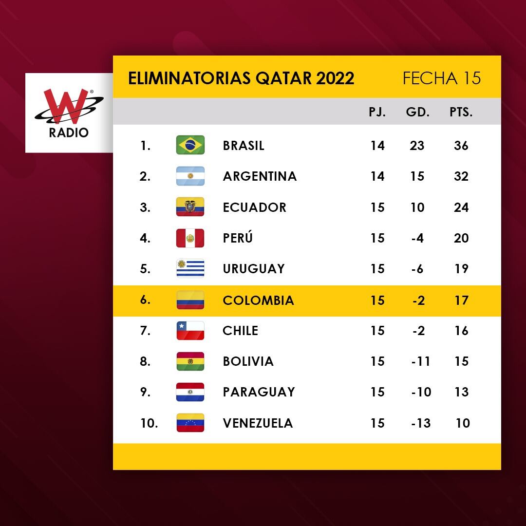 Vea a continuación la tabla de las Eliminatorias tras la fecha 15: