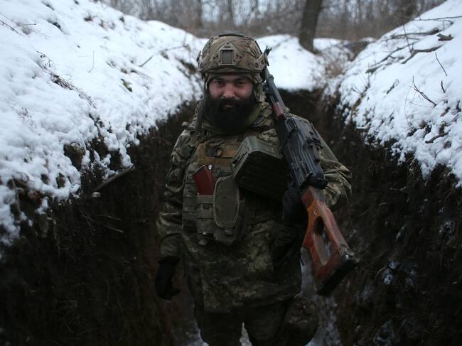 An Ukrainian Military Forces serviceman poses with his weapons in a trench on the frontline with the Russia-backed separatists near Zolote village, in the eastern Lugansk region, on January 21, 2022. - Ukraine's Foreign Minister Dmytro Kuleba on January 22, 2022, slammed Germany for its refusal to supply weapons to Kyiv, urging Berlin to stop "undermining unity" and "encouraging Vladimir Putin" amid fears of a Russian invasion. (Photo by Anatolii STEPANOV / AFP) (Photo by ANATOLII STEPANOV/AFP via Getty Images) / ANATOLII STEPANOV