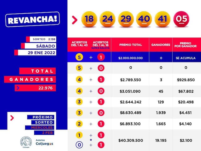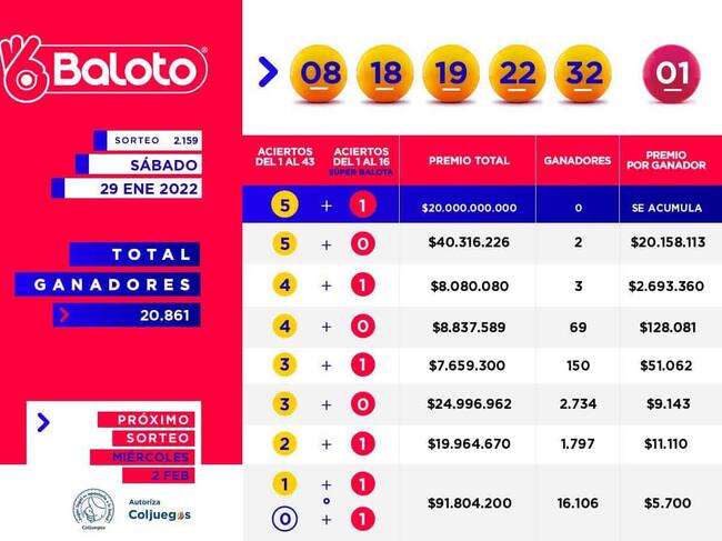 Este sábado 29 de enero de 2022 se jugó el Baloto y Baloto Revancha en su sorteo número 2.159 con un premio mayor de $20.000 millones que, desafortunadamente, ningún colombiano se llevó a casa.