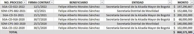 El funcionario, que también hizo parte de la Unidad de Apoyo Normativo de Angélica Lozano, trabaja hace años en el Distrito. Lo que llamó la atención de Andrés Forero es que en cuatro años con Enrique Peñalosa suscribió contratos por $260 millones mientras que en la Alcaldía actual, en tan solo dos años, ha suscrito contratos por $860 millones.