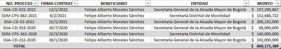 El funcionario, que también hizo parte de la Unidad de Apoyo Normativo de Angélica Lozano, trabaja hace años en el Distrito. Lo que llamó la atención de Andrés Forero es que en cuatro años con Enrique Peñalosa suscribió contratos por $260 millones mientras que en la Alcaldía actual, en tan solo dos años, ha suscrito contratos por $860 millones.
