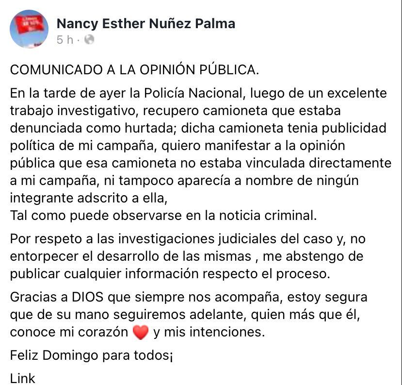 También aclaró: “esa camioneta no estaba vinculada a mi campaña ni tampoco aparecía a nombre de ningún integrante adscrito a ella”.